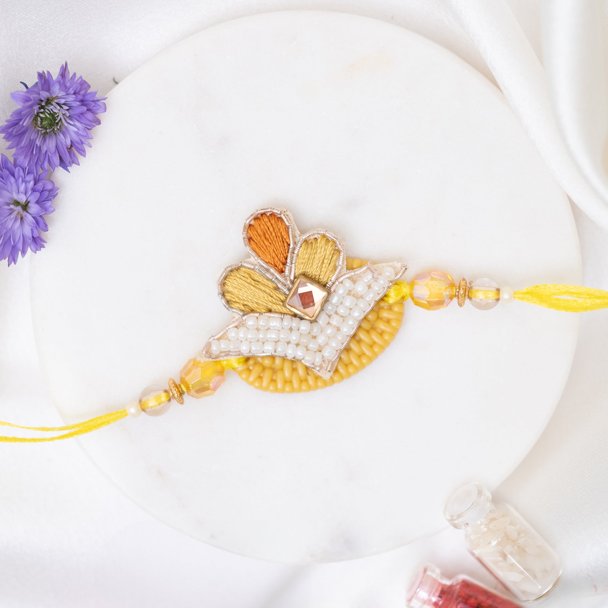 Handcrafted Flower Pearl Rakhi wth Roli Chawal Set