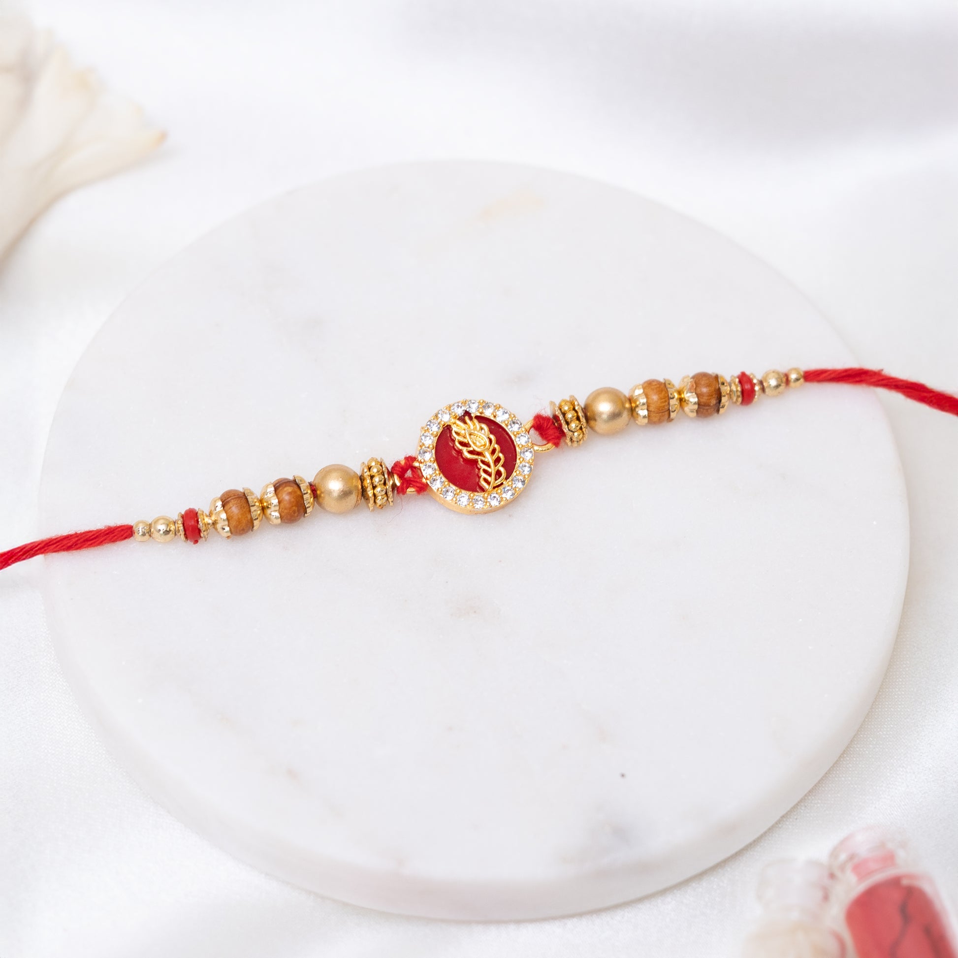 Peacock Glory Rakhi in Red and Gold With Roli Chawal Set