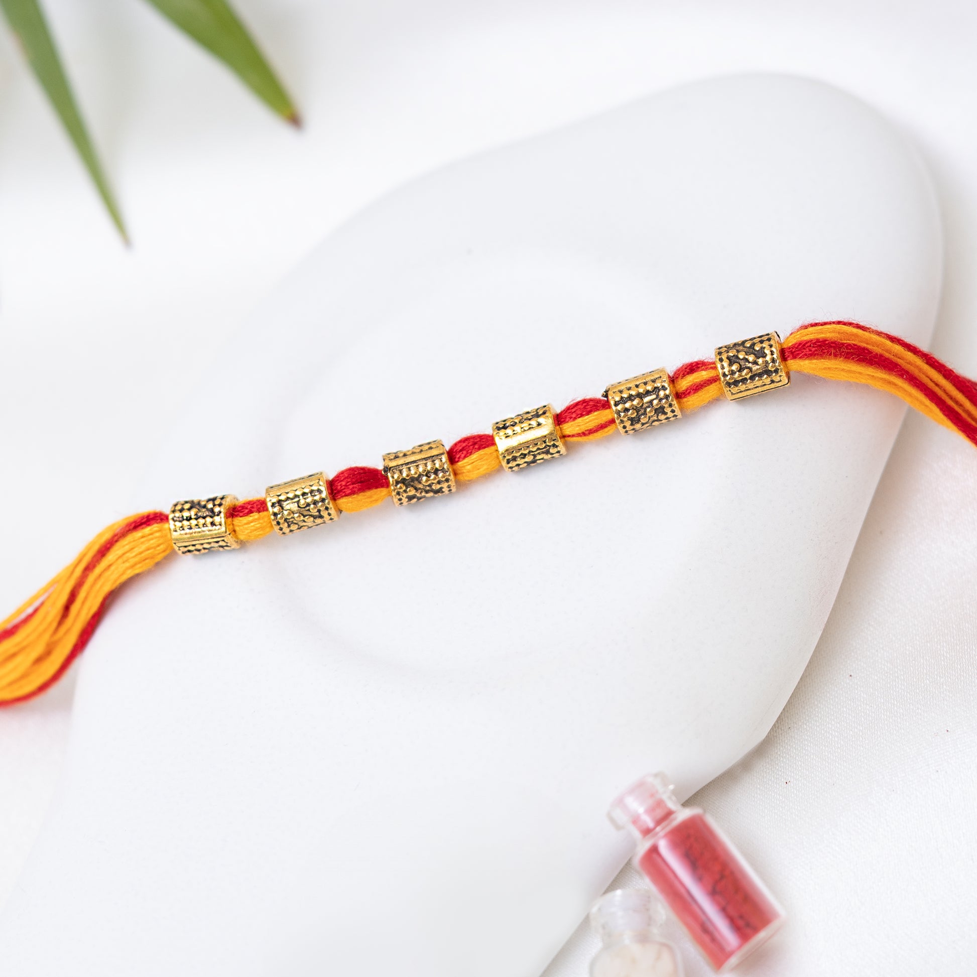 Red-Yellow Rakhi with Antique Charm set of 3 with Roli Chawal Set